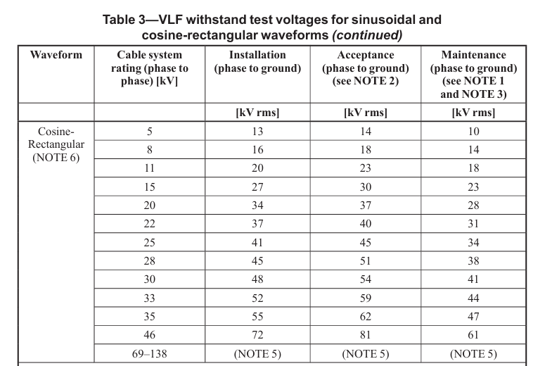 - Níveis de Tensão de VLF Atualizados: a norma de 2024 especificou novos níveis de Tensão para o ensaio de VLF, ampliando o escopo para contemplar cabos com classes de tensão mais elevadas, agora incluindo sistemas de até 138 kV. Conforme apresentado nas Tabelas abaixo.