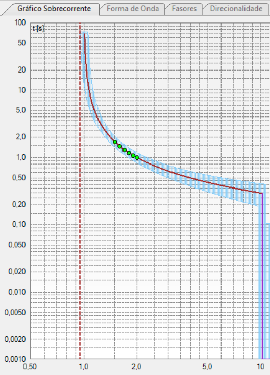 Abaixo apresenta-se um exemplo de curva IEC Normal Inversa, destacando os respectivos pontos testados para ilustrar seu comportamento da proteção 51 (sobrecorrente).