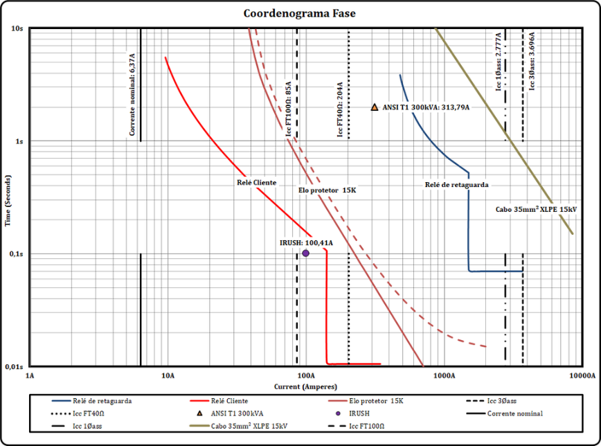 Estabelecido uma hierarquia de dispositivos de proteção, coordenando-os para garantir que o dispositivo mais próximo da falha atue primeiro, assim como apresentado no coordenograma abaixo.